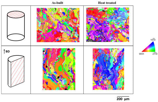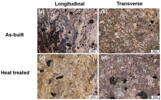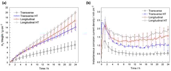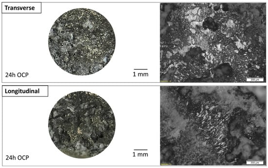 - Regarding the alloy in the as-built state, the PDP curve showed that the longitudinal plane exhibited higher anodic kinetics than the transverse plane. This is consistent with the measurements obtained by EIS and H2 collection, demonstrating that the transverse plane presented greater corrosion resistance than the longitudinal plane.