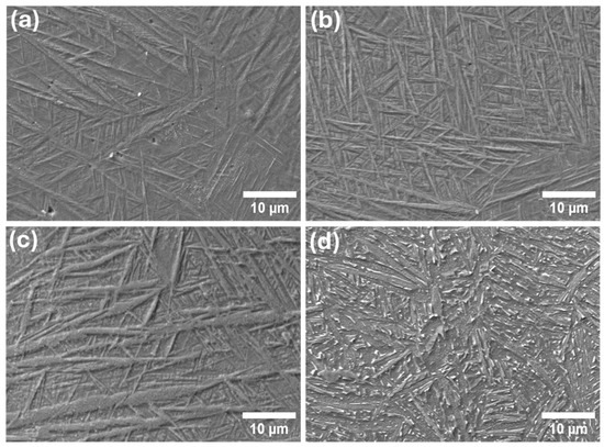 SEM images of L-PBF Ti6Al4V at different heat treatment temperatures: (a) As-built, (b) 400 °C, (c) 600 °C and (d) 800 °C.