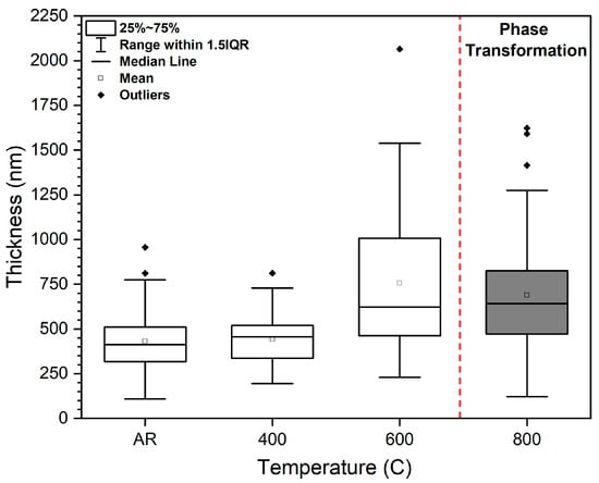 Further statistical analysis of the metastable α′ phase thickness, as presented in Figure 2, reveals a marked increase in α′ thickness as the heat treatment temperature rises from 400 °C to 600 °C. This trend reflects the enhanced atomic diffusion at elevated temperatures, which promotes coarsening of the martensitic structure [16]. However, at 800 °C, the growth of the α′ phase becomes less pronounced. This deviation is attributed to the onset of a thermodynamically driven phase transformation, where the metastable α′ phase begins to decompose into the equilibrium α + β microstructure [13]. Therefore, while some coarsening of the α′ phase may still occur at 800 °C, the dominant microstructural evolution at this temperature is the transformation into a stable dual-phase system. This suggests that, under these thermal conditions, phase transformation is energetically more favourable than continued growth of the non-equilibrium α′ phase [10].
