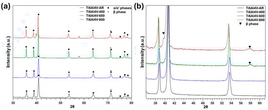 (a) X-ray diffraction pattern of LPBF Ti6Al4V alloys in the as-built condition and after thermal treatment at 400/600/800 °C; (b) details of the β-phase formation at 600 and 800 °C.