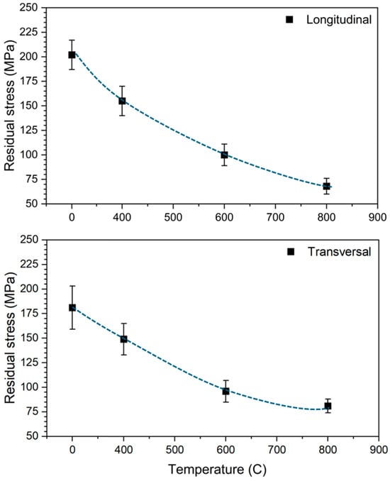 Furthermore, XRD residual stress measurements were carried out to assess the extent to which thermal treatments influence the residual stress state in L-PBF processed Ti6Al4V. As shown in Figure 4 and summarised in Table 1, residual stresses decreased progressively with increasing heat treatment temperature in both the longitudinal and transverse directions. The most substantial reduction occurred between the as-built condition and the 600 °C treatment, with comparatively smaller changes observed beyond this temperature.