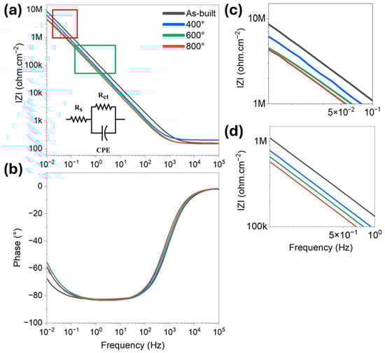 As illustrated in Figure 5, the differences in impedance response across specimens subjected to various heat treatment temperatures clearly demonstrate the impact of thermal exposure on the properties of the passive oxide layer. Notably, the impedance modulus decreased significantly in both the low- and mid-frequency regions for all heat-treated samples when compared to the as-built condition. The most pronounced reduction was observed in specimens treated at 800 °C, whereas the variation in modulus between the 400 °C and 600 °C treatments was comparatively minor. These trends suggest a strong correlation between the impedance response and the evolving microstructural characteristics and residual stress state of the L-PBF processed material [25,59].