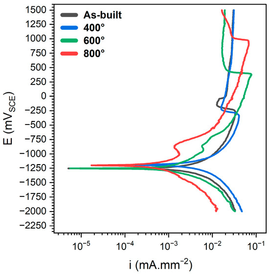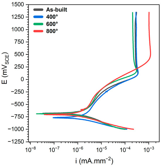 Potentiostatic polarisation tests were conducted under constant potential following the application of tensile strain to all specimens. A potential of +1500 mV vs. SCE was selected for each test, based on prior potentiodynamic polarisation results under identical conditions. This ensured a consistent and comparable basis for evaluating the potentiostatic response across all samples. As illustrated in Figure 7 and summarized in Table 4, the potentiodynamic polarisation analysis under aggressive fluoride-contaminated conditions revealed a consistent trend: the as-built and 400 °C heat-treated specimens exhibited the lowest anodic current densities, indicating more effective passivation behaviour. In contrast, samples treated at 600 °C and 800 °C displayed progressively higher anodic current densities, suggesting a deterioration in the stability and protectiveness of the passive film with increasing heat treatment temperature.