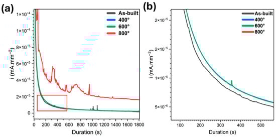 Potentiostatic polarisation results within the passive region as shown in Figure 8 revealed notable differences in the corrosion behaviour of the specimens, particularly highlighting the distinct response of the sample treated at 800 °C. The as-built specimen exhibited the most rapid stabilisation of current density, indicating a swift formation of a stable passive layer. This behaviour was closely followed by the samples treated at 400 °C and 600 °C, which demonstrated similar trends with only slight variations in passive current density and stabilisation time.