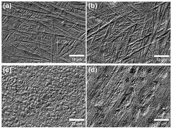 Microstructural analysis of the heat-treated specimens as shown in Figure 1 reveals a clear evolution of phase morphology as a function of temperature. In the as-built and low-temperature-treated samples (up to 600 °C), the microstructure was predominantly composed of a metastable martensitic α′ phase. This phase formation is characteristic of the L-PBF process, where extremely high cooling rates, resulting from steep thermal gradients generated by the laser, suppress diffusion-driven phase transformations [20,44]. As a result, the stable equilibrium α + β phases observed in conventionally processed Ti6Al4V are bypassed, and the microstructure instead solidifies into fine, acicular α′ martensite. These α′ structures exhibit as small, needle-like features often [45,46].