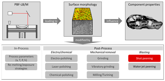 Other than this, the surface and subsurface regions can also be modified within the PBF-LB/M process (“in-process”) through so-called re-melting strategies [25,26]. Additionally, “post-processing” strategies can be used to modify the topography, microstructure and properties of the surface and subsurface regions. An overview of possible post-processing strategies related to AM is given in Figure 1.