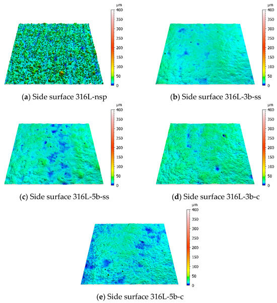 Figure 2 shows the surface topographies obtained for the 316L specimens with confocal microscopy. From these measurements of the surface topography, the corresponding quantitative values were derived, as shown in Table 2.