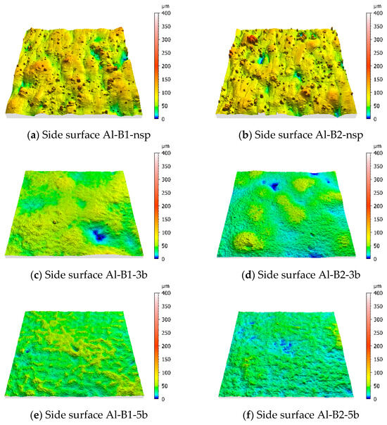 Figure 3 shows the surface topographies obtained for the AlSi10Mg specimens, and the corresponding quantitative values are given in Table 3.