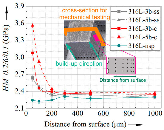 Due to the microstructural changes induced by shot peening, the respective change in the mechanical properties was analysed. For this, Figure 6 illustrates the microhardness distribution of the different 316L specimens in the subsurface region. This reveals an increase in hardness due to shot peening up to a surface distance of 200 µm, while the ceramic beads lead to a significantly higher hardness close to the surface. Note that the hardness measurements were performed beginning at a surface distance of 50 µm, and hence, at a sufficient distance from the embedded ceramic beads. Even at a lower shot peening pressure, a higher hardness is achieved than reached by stainless steel beads and a higher pressure of 5 bar. When comparing the effect of the different pressures, a hardness increase results from higher pressures when using ceramic beads, while roughly the same hardnesses are generated at both pressures with stainless steel beads.