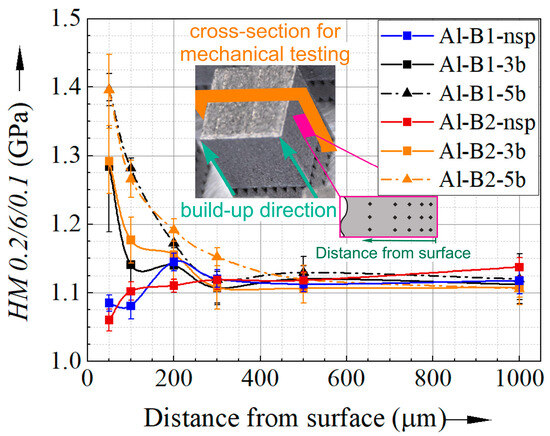 For AlSi10Mg specimens, the increase in hardness caused by shot peening is illustrated in Figure 7, showing for both batches a more pronounced hardness increase with higher shot peening pressures. This hardness increase is evident up to a surface distance of 200 µm compared to the non-shot-peened specimens. Note that the specimen of the batch B2 shot peened with 5 bar (Al-B2-5b) shows an increased hardness up to a surface distance of 300 µm, and thus, the most extended region of increased hardness. For the specimens shot peened with higher pressure, a continuous decrease in hardness with increasing surface distance is obvious, while the lower pressure leads to a stabilised hardness between 100 and 200 µm.