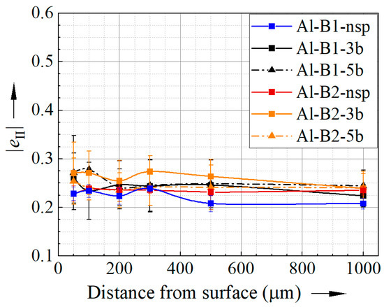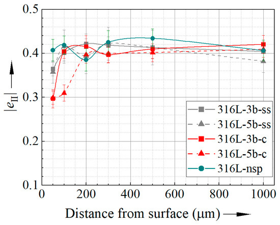 For a more detailed analysis of the mechanical properties in the subsurface region, the effect of shot peening on the cyclic deformation behaviour was analysed by means of the ha,p–N curves and the respective eII. Figure 8 shows the change in |eII| obtained from CITs for 316L specimens, revealing a reduction in |eII| in the subsurface region up to 100 µm, which was achieved with ceramic beads and 5 bar pressure. Using the lower pressure or stainless steel beads, a decrease in cyclic hardening potential is only achieved up to 50 µm. Thus, the decrease in |eII| correlates roughly with the increase in hardness shown in Figure 6. This is presumably caused by the substantial plastic deformation and the resulting increase in dislocation density, causing a strong work hardening effect. Consequently, in the hardened areas, the potential to form dislocations under additional loading is reduced, leading to a weaker cyclic hardening. Note that for the specimens shot peened with ceramic beads, these effects are observed at a sufficient distance from the embedded ceramic beads.
