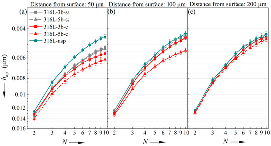 To analyse the cyclic deformation behaviour in the subsurface region of the 316L specimens, in Figure 9, the ha,p–N curves obtained at surface distances of 50 µm, 100 µm and 200 µm are illustrated.