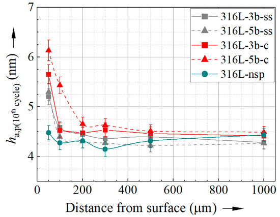 Changes in residual stresses and cyclic plasticity observed in CITs (represented by ha,p obtained in the 10th cycle) in dependency with the distance from the surface for the 316L specimen shot peened with ceramic beads and a pressure of 5 bar (316L-5b-c). Note that the CITs were performed at the same distances from the surface, as shown in Figure 6.
