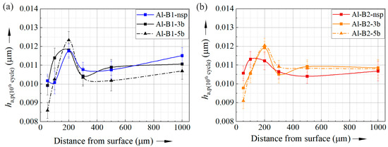 Comparing the evolution of ha,p(10th cycle) obtained for the shot-peened specimens with the respective non-shot-peened specimens, at 50 µm, the shot-peened specimens show smaller ha,p(10th cycle). At a surface distance of 200 µm, an increased ha,p(10th cycle) is shown for the shot-peened specimens, except the specimens of batch 1 shot peened with 3 bar (Al-B1-3b). While the lower ha,p(10th cycle) at 50 µm correlates with a higher hardness, at 200 µm, the shot-peened specimens reveal a higher hardness and higher ha,p(10th cycle).