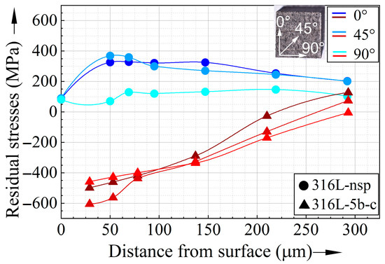 Figure 13 presents the residual stress profile of non-shot-peened 316L and the specimens shot peened with ceramic beads and 5 bar (316L-5b-c). Despite the embedded ceramic beads, the latter condition was chosen for the residual stress measurements since it showed the most pronounced changes in the subsurface region. However, as the ceramic beads would have an impact on the residual stress measurement at the surface, the outer surface layer and, hence, the ceramic beads were removed electrolytically in order to enable reliable residual stress measurements.