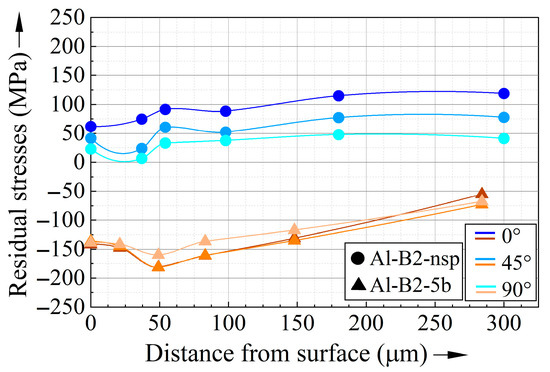 For AlSi10Mg, Figure 14 shows exemplarily the residual stresses measured during the “as-built” state of batch 2 and the respective specimen shot peened with 5 bar. The “as-built” specimen of batch 2 shows residual tensile stresses directly at the surface, slightly increasing up to a distance from surface of 175 µm, which stays constant up to 300 µm. This corresponds to the residual stresses measured in the “as-built” 316L specimen. In correlation with the results obtained for 316L, parallel to the build-up direction, the residual stresses are higher than perpendicular to that, indicating an inhomogeneous distribution of the residual stresses. As expected and similar to the results obtained for 316L, the shot-peened AlSi10Mg specimen revealed residual compressive stresses, which show a maximum at a distance from the surface of 50 µm. Subsequently, the residual stresses get less pronounced but are not relieved until 280 µm, which is contrary to the results obtained for 316L. However, the evolution of the residual stresses along all three directions is nearly identical, which indicates that the shot peening leads to a homogeneous distribution of the residual stresses, being in line with the results shown for 316L.