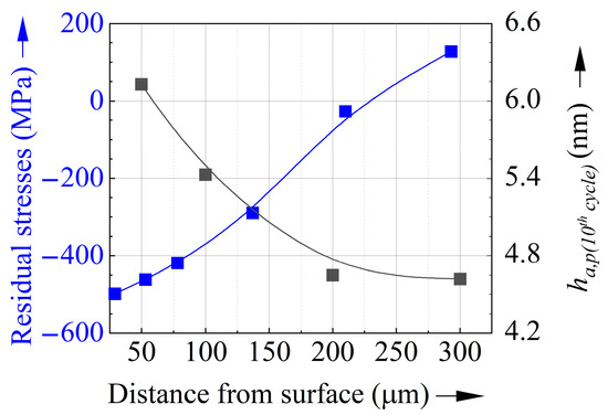 In accordance with Reference [43], the value of ha,p measured in the 10th cycle was considered to represent the extent of cyclic microplasticity for each surface distance investigated. Accordingly, Figure 10 illustrates the evolution of ha,p(10th cycle) along the surface distance, which corresponds to the qualitative analyses described above. Moreover, this evolution is similar to the hardness distribution shown in Figure 6. Hence, an increase in cyclic plasticity is accompanied with an increased hardness, which initially does not reveal any causal interaction. In this context, it was shown in previous work [43] that an increase in ha,p can be caused by compressive residual stresses, which is analysed in the following section.