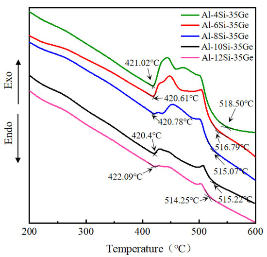 Figure 5 shows the DTA curves of Al-xSi-35Ge filler metals with different Si contents. The solidus temperature (Tm) and liquids temperature (T1) could be obtained by calculating the inflection point around the endothermic peak in the DTA curves. The peak at 500–510 °C represented the Al-Si(Ge) eutectic reaction, and the peak at 420–430 °C represented the Al-Ge eutectic reaction. It can be seen that peaks in DTA curves tend to shift to the right with increasing Si content. According to Figure 5, Tm of filler metals did not show a regular change as the Si content increased, while the T1 of filler metals showed a decreasing trend. The maximum T1 of the filler metal was 518.09 °C when the Si content was 4 wt.%, and the T1 decreased to 514.25 °C when the Si content was up to 12 wt.%.