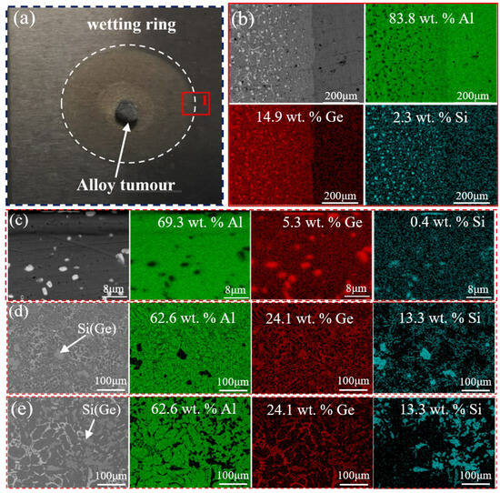 The wetting of Al-8Si-35Ge filler metal on the surface of the 6061 alloy: (a) wetting morphology; (b) the distribution of major elements of the wetting boundary marked with red line in (a); (c) the distribution of major elements of the cross-section of the wetting boundary; (d) original filler metal; and (e) residual filler metal.