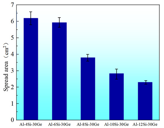 Figure 6 shows the wetting morphology and EDS analysis results of Al-8Si-35Ge filler metals on the surface of 6061 substrates at a temperature of 550 °C and a holding time of 4 min. It can be seen that although the wetting area of filler metals was relatively large, the spreading of the main filler metal was not ideal, forming an alloy tumor. Cheng et al. believed that this was due to severe loss of melting-point depressant element in filler metal, resulting in higher melting point of residual filler metal [27]. The microstructure and EDS analysis results of the wetting area of the Al-8Si-35Ge filler metal are shown in Figure 6b,c. It can be seen that the chemical composition of the wetting area were mainly Al and Ge, indicating that wetting of Al-Si-Ge filler metals was mainly related to Ge diffusion on the surface of base metal. Figure 6d,e displays the microstructure and major element distribution of Al-8Si-35Ge filler metal and residual filler metal. It can be seen that the characteristics of the Al-Si(Ge) eutectic structure disappeared in the microstructure of the residual filler metal, and the lumpy Si(Ge) phase increased. Moreover, Al-Ge eutectic reduced, and Ge content of filler metal reduced from 34 wt.% to 24.1 wt.%, which was consistent with analysis results from Figure 6b,c. The residual filler metal was harder to melt due to the loss of Ge. Figure 7 illustrates the spreading area of filler metals with different Si content on 6061 substrates. It can be seen that the spreading area decreased with the increasing Si content, suggesting that Si could prevent the spread of Al-Si-Ge filler metal and hinder the loss of Ge.
