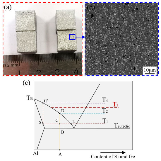 - Zhang, Y.; Gao, T.; Liu, X. Influence of Ge content on the microstructure, phase formation and microhardness of hypereutectic Al-Si alloys. J. Alloys Compd. 2014, 585, 442–447. [Google Scholar] [CrossRef]