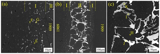 As illustrated in Figure 9, the microstructure of 6061 brazed structures with Al-8Si-35Ge was investigated when the brazing temperature was 550 °C. It can be seen from Figure 9b that the brazed joint consisted of two solid diffusion reaction layers (Zone I) and a filler metal residual zone (Zone II). Zones I was close to the 6061 alloy substrate and was composed of black phase, gray particle phase, and gray–white particle phase, which were represented by phases of E, F, and G in Figure 9a. Zone II was composed of black phase, gray block phase, gray–white block phase, and white phase, which were represented by phases H, I, J, and K in Figure 9c. It can be seen from the chemical composition in Table 2. The chemical composition of phase E was 97.4 wt.% Al + 1.7 wt.% Si + 0.9 wt.% Ge. Phase E was α-Al according to the Al-Si-Ge phase diagram. Phase F had brighter contrast when compared to the A phase. As indicated in Table 1, the chemical composition of phase F was 90 wt. % Al + 1.9 wt. % Si + 9.1 wt. % Ge. F phase was deduced to be Al-rich (Al, Ge) according to [15]. The contrast of the G phase was the lightest, compared to the phases of E and F. As indicated in Table 1, the chemical composition of phase G was 47.6 wt.% Al + 0.9 wt.% Si + 0.6 wt.% Si + 51.5 wt.% Ge. Phase G was deduced to be (Al, Ge) according to Ref. [23]. The chemical composition of phase H was close to phase E, and phase H was α-Al. The chemical composition of phase I was 1.2 wt.% Al + 59.2 wt.% Si + 39.6 wt.% Ge. Phase I was Si-rich Si(Ge) according to the Si-Ge phase diagram. As indicated in Table 1, the chemical composition of phase J was comparable to that of phase I, but Ge content at phase J was larger, being 55.6% (wt.%). Phase I was (Si, Ge). The chemical composition of phase K was 50.3 wt.% Al + 0.4 wt.% Si + 49.7 wt.% Ge. Phase K was (Al, Ge).