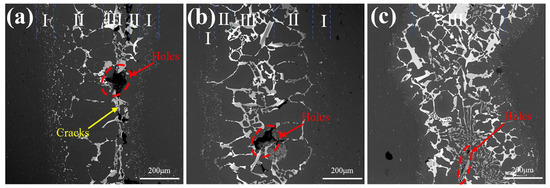 Figure 10 shows the microstructure of 6061 joints with Al-xSi-35Ge filler metals with different Si contents. The microstructure of joints with different filler metals was similar. Holes and cracks were found in the brazed joints, and it was reduced with the increasing Si addition. The causes of defects were closely related to the liquidation of filler metal. The Al-Ge eutectic phase began to melt at 420 °C, and the Al-Si eutectic phase completely melted above 514 °C. The Al-Ge eutectic with a low melting point melted and flowed along the surface of 6061 substrates, resulting in changes in the chemical composition of the residual filler metal. The melting point of residual filler metal increased, and it was difficult to melt at the predetermined brazing temperature due to the decreasing Ge content. The increase in melting point deteriorated the metallurgical bonding between residual filler metal and 6061 substrates and resulted in the formation of defects.