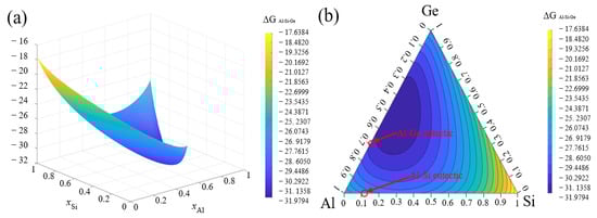 (a) Three-dimensional graphs and (b) corresponding contour maps for calculated free energy of Al-Si-Ge ternary system (ΔGAl-Si-Ge) at 550 °C.