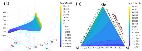 Figure 11 shows the calculation results of the free energy of the Al-Si-Ge ternary system (GAl-Si-Ge) at 550 °C. It can be seen that GAl-Si-Ge was always negative, indicating spontaneous metallurgical reactions in the Al-Si-Ge ternary system. The position GAl-Si-Ge was on the Al-Ge side, indicating the existence of an Al-Ge eutectic phase in the alloy system. Figure 12 shows the calculated chemical potential of Ge (μGe) in the Al-Si-Ge ternary system at 550 °C. The μGe was −44.8 kJ/mol when the Al content was 98 wt.% (corresponding to the Al content of 6061). The μGe was higher than −10 kJ/mol when the Al content was 60 wt.% (corresponding to the Al content of Al-Si-Ge filler metals). Therefore, the driving force for Ge diffusion to regions with high Al content was higher, namely the trend of Ge diffusion from the filler metals to the 6061 substrates was higher. The reaction between the filler metal and 6061 substrates was achieved through the diffusion of Ge from the filler metals to the 6061 substrates, which was consistent with the EDS analysis results. The loss of Ge led to a decrease in residual solder activity and an increase in joint defects. According to the calculation results, the μGe in 6061 substrates was −24.5 kJ/mol. The μGe in Al-4Si-35Ge filler metal was greater than −1.5 kJ/mol, but it significantly decreased to −8.4 kJ/mol when the Si content was up to 12 wt.%. Obviously, Si addition could narrow the difference of μGe in the filler metals and 6061 substrates. The lower difference of μGe mean that weak trend of Ge diffusion from filler metals to 6061 substrates.