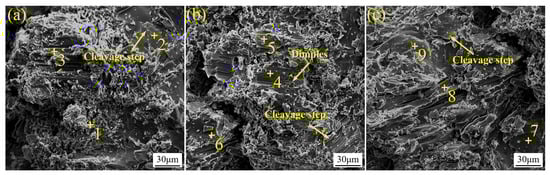 The shear strength of 6061 joints is demonstrated in Figure 13. The shear strength with Al-4Si-35Ge filler metal was 19.6 MPa. When the Si content was up to 8 wt.%, the shear strength reached the maximum (57.3 MPa), but it decreased to 31.2 MPa with the further addition of Si. The fracture morphology of 6061 joints brazed with Al-Si-35Ge filler metals is shown in Figure 14. The chemical composition in the marked positions on the fracture surface is displayed in Table 3. The α-Al (positions 1, 4, 7), Ge (positions 2, 5, 8), and Si(Ge) (positions 3, 6, 9) were detected on the fracture surfaces. According to Figure 14a, there were a large number of cleavage steps and planes on Ge (position 2) and Si(Ge) (position 3) phases. The existence of the cleavage plane indicated cleavage fracture. However, no fracture characteristic on α-Al was observed, suggesting the existence of defects in the joint. Hence, the fracture mode of joints was “cleavage fracture + cleavage fracture”, and the joint shear strength was 19.6 MPa. It could be seen from Figure 14b that dimples on α-Al were observed (position 4) when using Al-8Si-35Ge filler metal. The existence of the dimples indicated ductile fracture. Similarly, cleavage steps and planes on Ge (position 5) and Si(Ge) (position 6) phases. Therefore, the fracture mode of joints was “ductile fracture + cleavage fracture”, and the shear strength was increased to 57.3 MPa. The fracture morphology of the joint with Al-12Si-35Ge filler metal is presented in Figure 14c. Ge (position 8) and Si(Ge) (positions 7, 9) were characterized by a lamellar cleavage plane, suggesting that the fracture mode of joints was “cleavage fracture “. It can be seen from Figure 10 that Si(Ge) and Ge in the brazed joints increased and coarsened when Ge content in filler metals rose from 4 wt.% to 12 wt.%. Moreover, the indentation hardness of Al, Ge, and Si(Ge) was 0.7 GPa, 10.2 GPa, and 11.5 GPa, respectively [24]. The coarse brittle phase reduces the toughness of the joint, leading to local stress concentration and cracking when the joint was subjected to shear force, thereby reducing the shear strength of the joint. Hence, the shear strength decreased to 31.2 MPa when Si content in the filler metals was 12 wt.%.