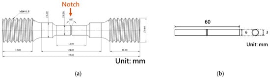 To determine the mechanical properties, a tensile tester (SHI-MADZU AGX-V2, Kyoto, Japan) was used to measure the tensile strength and elongation at a tensile rate of 1 × 10−3 s−1. In addition, a tensile fatigue test was conducted using an electric fatigue tester (EA05 Electromechanical Testing, STEP Lab, Brenta, Italy). Subsequently, the stiffness was evaluated, and the damage mechanism was analyzed. The specifications of the specimens used for the tensile fatigue tests are shown in Figure 2a. The impact toughness test was conducted using a pendulum impact tester (HUNGTA HT-8041A, Taichung, Taiwan). The specifications of the specimens used for the impact testing are shown in Figure 2b. The test parameters included a pendulum weight (W) of 1.54 kgf, a swing radius (R) of 17.61 cm, and an initial impact angle (α) of 150°. The impact toughness was calculated based on the energy required to fracture the specimen, which represented the energy absorbed per unit area and served as an indicator of the material’s resistance to impact.