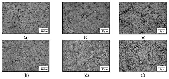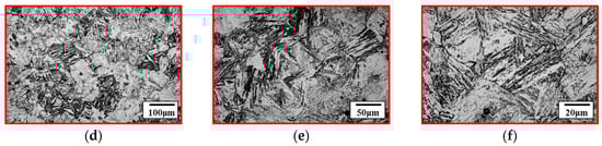 Microstructure of CH241 before and after furnace cooling: CH241-C: (a) 100×, (b) 200×, (c) 500×; CH241-FC: (d) 100×, (e) 200×, (f) 500×.