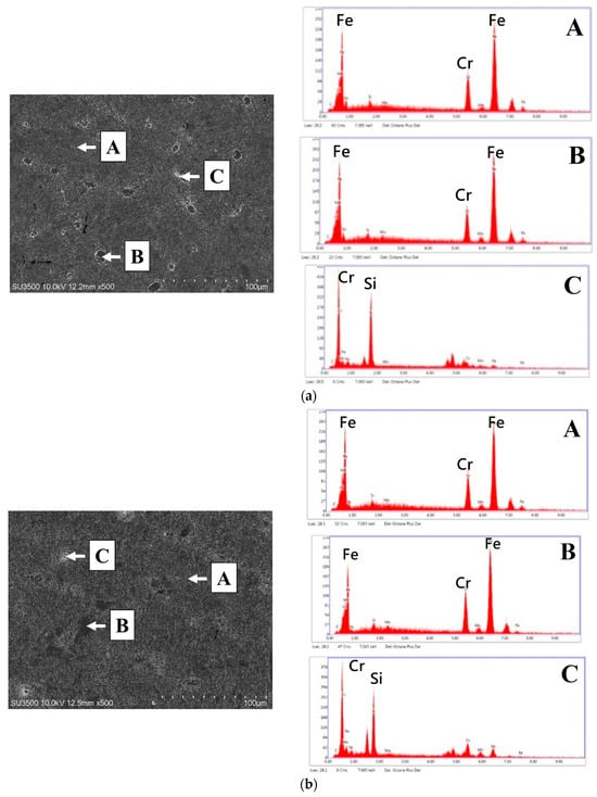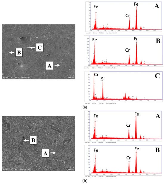 EDAX analysis revealed that the C content in the martensitic regions was lower than that in the austenite regions (also known as high-carbon austenite), whereas the Cr content was higher. Additionally, small, rounded precipitates were observed in the matrix, which were identified by EDAX as carbide clusters (precipitated carbides) containing Cr and Si and classified as silicon-rich chromium carbide phases []. Notably, as shown in Figure 6 and Table 3, EDAX analysis of CH241-C revealed that the matrix primarily consisted of a large amount of austenite with a small amount of needle-like martensite. In the case of CH241-FC, the number of precipitated carbides in the matrix significantly increased, which was the primary reason for the enhanced hardness of CH241-FC. This shows that furnace cooling can not only homogenize the material elements (reduce the segregation effect) but also transform the matrix into martensite and slowly precipitate alloy carbides.