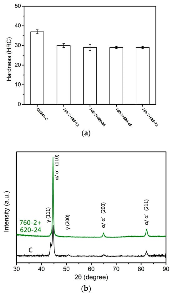 Hardness and XRD analysis of CH241 after two-stage heat treatment conditions: (a) hardness; (b) XRD analysis.