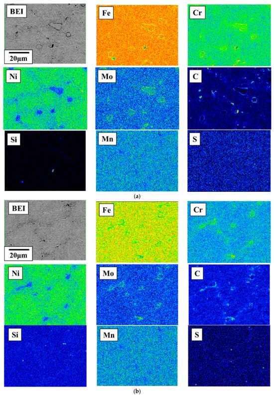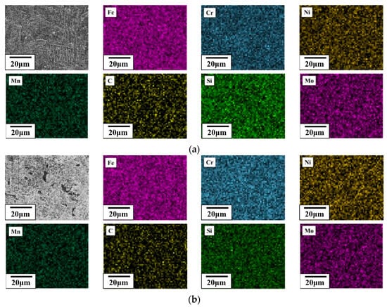 In addition, mapping analysis was performed for CH241-C, CH241-FC, and CH241-ST (soft-tough two-stage heat treatment) (Figure 10 and Figure 11). The results showed that the needle-like martensite phase transformed into a high-carbon austenite phase, with the precipitates becoming coarser and more concentrated at the grain boundaries. To investigate the specific diffusion pathways of the alloying elements, this study analyzed the EPMA data (Figure 12), which indicated that the primary precipitates resulting from the as-cast material undergoing a two-stage over-aging heat treatment were Cr(Ni-Mo)C carbides [,]. These precipitates accumulated at the grain boundaries of the original martensite phase.