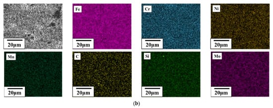 In this study, a Rockwell hardness tester (Mitutoyo Hardness Tester, AR-10, Kawasaki, Kanagawa, Japan) with a diamond indenter and a 150 kgf load was used to measure the HRC of the material. The reported hardness values represent the averages of five measurements. An optical microscope (OM, OLYMPUS BX41M-LED, Tokyo, Japan) was used to analyze the microstructural characteristics of the CH241 stainless steel after grinding and polishing. To investigate the diffusion effects of alloying elements in as-cast CH241 under various heat treatment conditions, a scanning electron microscope was used to observe structural changes, while energy-dispersive X-ray spectroscopy (Electron Probe X-ray Microanalyzer, EDAX, JEOL Ltd., Akishima, Japan) was used for qualitative elemental analysis and semi-quantitative analysis of the elemental concentration. In addition, high-resolution microstructural analysis of the CH241 material subjected to two-stage heat treatment was conducted using a field-emission electron probe microanalyzer (EPMA, JEOL JXA-8530, Akishima, Japan). This analysis aimed to establish the thermal diffusion mechanism of CH241 and clarify the characteristics of the primary carbides [].