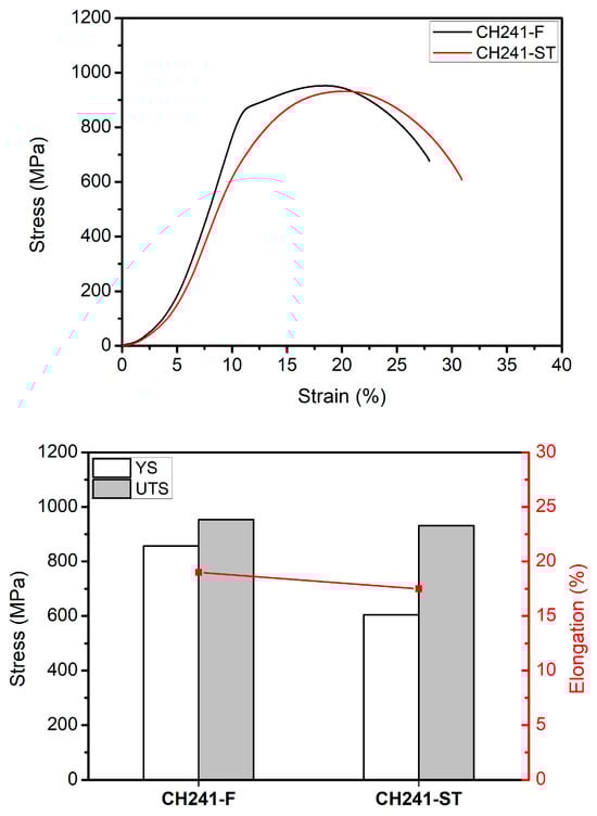 Comparison of tensile curves and mechanical properties of CH241-F and CH241-ST.