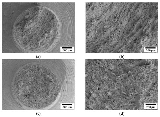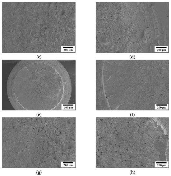 Room-temperature tensile fatigue tests were conducted on CH241-F and CH241-ST under a fatigue stress baseline of 600 MPa (Figure 18a). The results indicate that the stiffness of both materials remained stable as the number of fatigue cycles increased. However, as they approached the fatigue life limit, the stiffness decreased sharply, ultimately leading to failure (Figure 18b). Further analysis of the stress–displacement curves at different cycle stages (Figure 19) revealed that the stiffness of the materials decreased with increasing fatigue cycles. Figure 20 shows the fracture morphology of CH241 after tensile fatigue testing, exhibiting the typical features of fatigue failure. Fracture initiation occurred at a stress concentration site, followed by stable crack propagation across the fatigue zone. Once the remaining cross-sectional area became insufficient to sustain the applied load, rapid fracture occurred, characterized by dimpled morphology, indicating a ductile fracture mode. The final fracture surfaces (Figure 20g–h) reveal equiaxed dimples, which are typical of micro-void coalescence, confirming a ductile failure mechanism rather than brittle fracture.