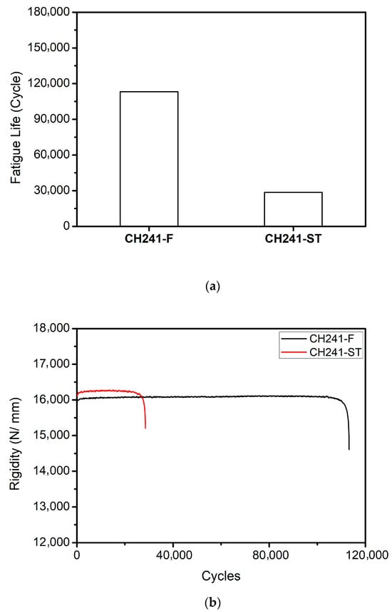 Room-temperature fatigue test of CH241-F and CH241-ST: (a) comparison of fatigue life; (b) comparison of stiffness curves.