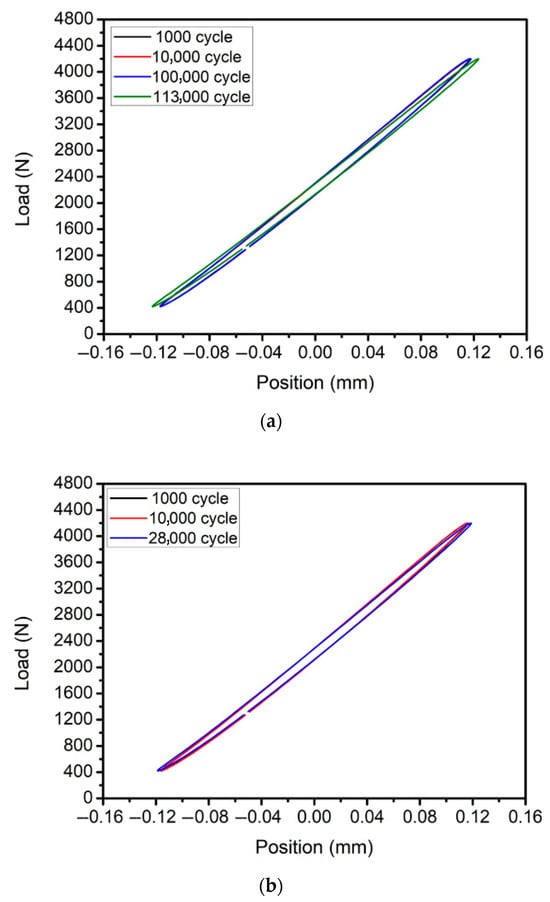 Stress–displacement curves of CH241-F and CH241-ST at different fatigue cycles: (a) F-600 MPa; (b) ST-600 MPa.