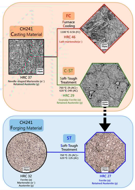 This study independently designed and developed a high-Mn and high-Mo stainless steel alloy material, and its chemical composition is presented in Table 1. CH241 stainless steel is characterized by its low Ni (4 wt.%), high Mn (1.3 wt.%), and high Mo (0.6 wt.%) composition, developed to balance cost efficiency with mechanical performance. Each element serves a specific metallurgical purpose: Cr enhances corrosion resistance, Mn stabilizes austenite in place of high Ni content, Mo improves strength and pitting resistance, while C and Si contribute to hardenability and carbide stability. The cast material (CH241) was designated as CH241-C (casting). To investigate the fundamental properties and heat treatment characteristics of CH241, a systematic exploration of the heat treatment conditions was conducted to examine the corresponding hardness values, as shown in Table 2. The CH241-C sample was subjected to heat treatment at 1100 °C for 30 min, followed by furnace cooling (denoted as CH241-FC, furnace-cooled), and its hardness was measured. Subsequently, a two-stage heat treatment (soft-tough) was applied. In the first stage, the CH241-C material was heated to 760 °C for two hours and then air-cooled to room temperature. In the second stage, the hardness values were measured after holding the material at 620 °C for various durations (12, 24, 48, and 72 h). This enabled the construction of an over-aging hardness curve and the evaluation of the thermal stability of the material []. In addition, the as-cast CH241-C material was hot-forged at 1200 °C to simulate industrial processing and improve internal densification; this forged material is referred to as CH241-F. The same two-stage heat treatment procedure was also applied to CH241-F, yielding a soft-tough variant named CH241-S. The heat treatment process is illustrated in Figure 1.