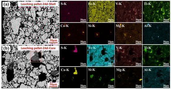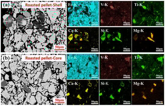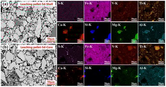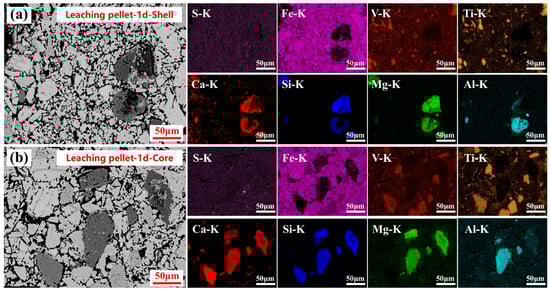 The microstructure and elemental distributions at both the shell and core of the roasted calcification pellets are shown in Figure 2a,b. The microstructural analysis revealed that the pellets were thoroughly oxidized, exhibited a uniform structure, and contained abundant inter-particle pore features that are favorable for vanadium extraction via sulfuric acid leaching. Elemental mapping further indicated a strong spatial correlation between vanadium and titanium, as well as between calcium, magnesium, and silicon. These observations suggested that vanadium in the roasted calcification pellets was primarily associated with plate titanite and silicate phases.