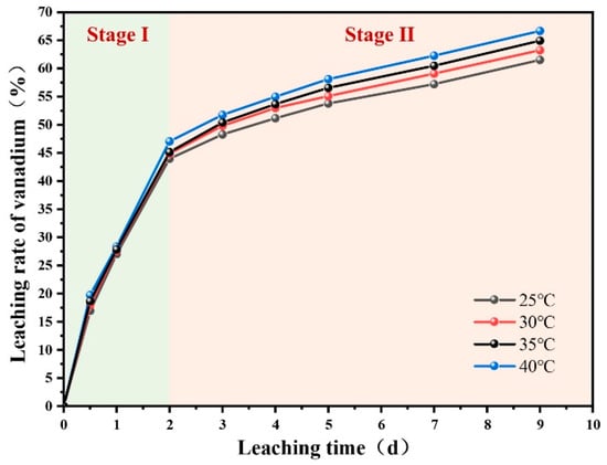 The sulfuric acid leaching results at different temperatures over a 9-day period are presented in Figure 3. It was evident that increasing the leaching temperature from 25 °C to 40 °C enhanced vanadium leaching efficiency during the leaching process. Furthermore, the leaching behavior over the 0–9-day period can be divided into two distinct stages based on changes in the vanadium leaching rate. In the first stage (0–2 days), vanadium leaching efficiency increased rapidly, reaching approximately 45% within two days. In the second stage (2–9 days), the vanadium leaching rate declined significantly, and the leaching efficiency increased more slowly, ultimately reaching about 60–65% by day 9.