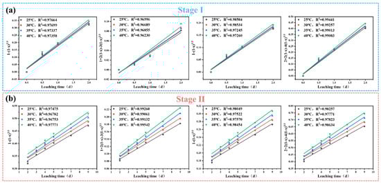 Plot of 1 − (1 − x)2/3, 1 + 2(1 − x) − 3(1 − x)2/3, 1 − (1 − x)1/3, and 2 + 2(1 − x) − 4(1 − x)2/3 versus leaching time at (a) stage Ⅰ (0–2d) and (b) stage Ⅱ (2–9d).
