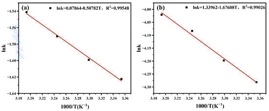 Arrhenius plot for the leaching process controlled by liquid film diffusion and internal diffusion of solid phase product control at stage Ⅰ (a) and internal diffusion of solid phase product control at stage Ⅱ (b).