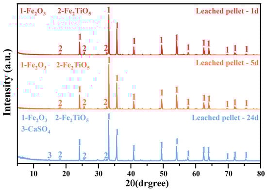 The XRD patterns of the leached pellets after 1, 5, and 24 days of sulfuric acid leaching are shown in Figure 9. The main phases identified in the leached samples were Fe(Ti)2O3 and Fe2TiO5. These results indicated that the sulfuric acid leaching process exhibited good selectivity for vanadium, while iron-bearing phases such as hematite and titanite displayed poor solubility. Additionally, after 24 days of sulfuric acid leaching, characteristic peaks corresponding to calcium sulfate began to appear. This phase formed through the acid dissolution of calcium-containing silicate minerals in the calcification roasted pellets, followed by the reaction of released calcium with sulfate ions. The results suggested that the formation and growth of calcium sulfate were promoted with prolonged leaching time. These XRD findings were consistent with the observed microstructure and elemental distribution of the leached pellets.