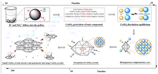 Previous studies have shown that the formation of solid calcium sulfate during the roasted-calcification-pellet sulfuric acid leaching hindered the diffusion of reactants and leaching products. In this section, the crystallization behavior and growth mechanism of calcium sulfate were further investigated to elucidate its role in limiting vanadium leaching efficiency. These insights aimed to provide a foundation for developing strategies to enhance vanadium recovery in subsequent work.