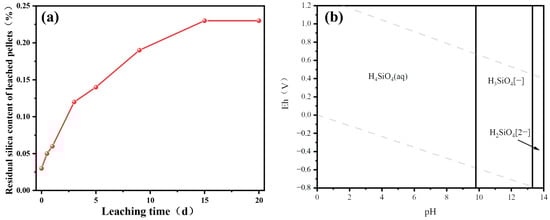 Alkali leaching results of sulfuric acid-leached pellets (a) and E-pH of silicic acid (b).