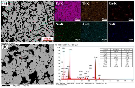 The sulfuric acid leached pellets were alkaline-leached subsequently with sodium hydroxide to further demonstrate the formation of silica sol during sulfuric acid leaching. The microstructure and elemental distribution of the alkali leached pellets are shown in Figure 12. After alkaline leaching, the main physical phase of the leached pellets did not change; they were still dominated by titanium hematite and plate titanium with a strong correlation between iron and titanium elements. It was noteworthy that there was a strong correlation between sodium and silicon elements in the alkali leached pellets, and that the associated sodium-containing particles were located on the surface of titanium hematite particles. The EDS analysis shown in Figure 12b further proved that the gray particles on the surface of titanium hematite particles were sodium silicoaluminate. The acid leaching process of roasted calcification pellets generated silicic acid, which accumulated and grew during the long leaching process and adhered to the surface of vanadium-containing particles, hindering the reaction between vanadium-containing phases and sulfuric acid, thus reducing the vanadium leaching efficiency.