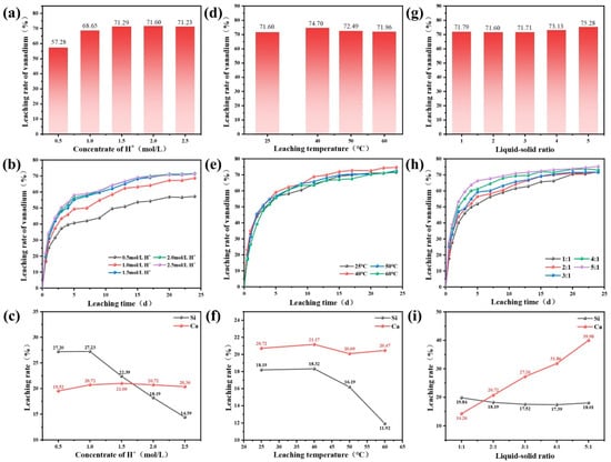Effect of H+ concentrate (a–c), leaching temperature (d–f), and liquid–solid ratio (g–i) on vanadium, calcium, and silicon leaching rate.